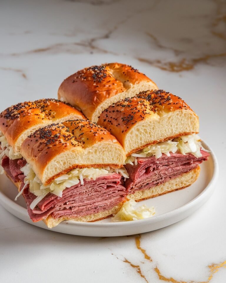 Juicy Reuben sliders packed with corned beef and melty Swiss transform game day snacking, but the secret butter sauce will leave you speechless.