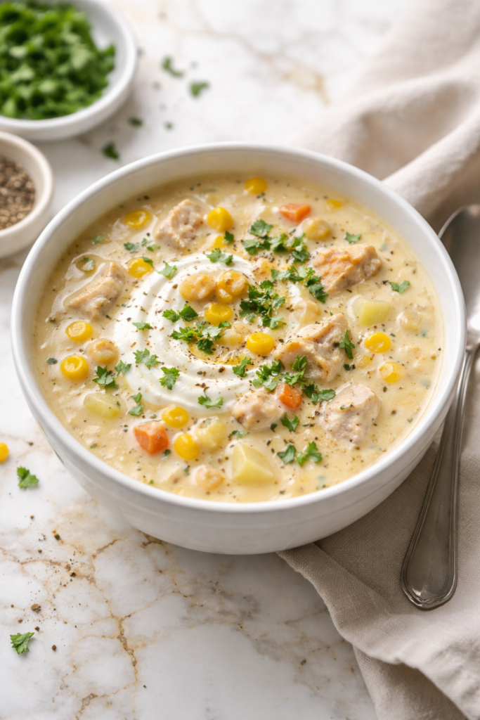 Creamy Corn and Chicken Chowder is a comforting, dependable recipe that brings warmth and flavor to the table with minimal effort. Its creamy texture and balanced ingredients make it a satisfying meal for any day of the week.