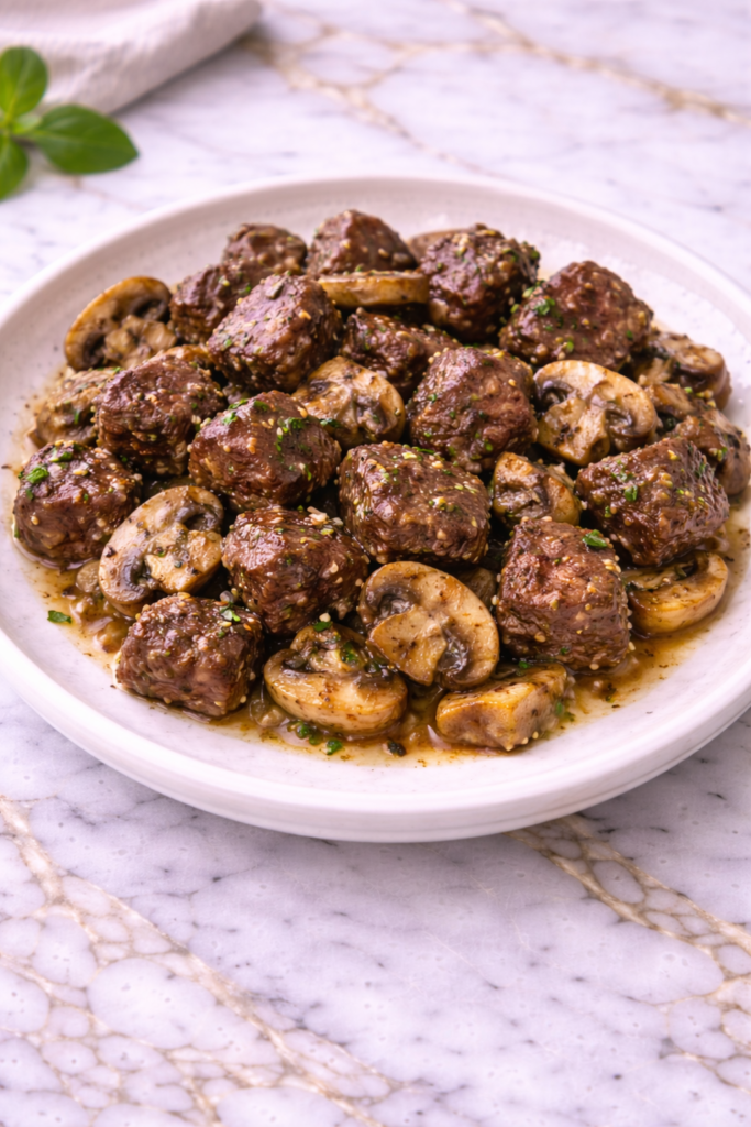 Garlic Butter Steak Bites with Mushrooms delivers bold, rich flavor in every bite. The steak is seared to perfection, creating a golden crust while staying tender inside. The mushrooms soak up the garlic butter, adding depth and a savory balance to the dish.