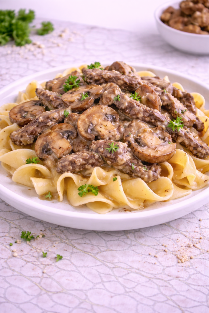 This beef stroganoff is deeply comforting, with tender slices of beef coated in a silky, savory sauce that feels rich without being overwhelming.