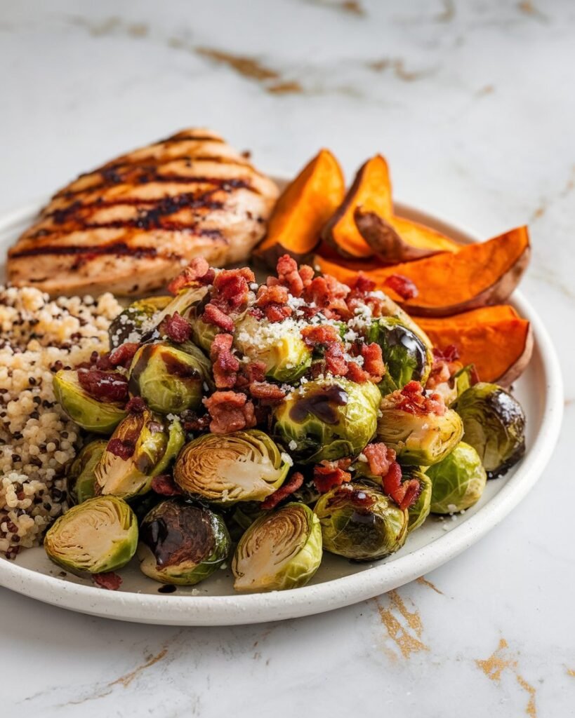 For a complete meal, I’d add a starchy side like creamy mashed potatoes or wild rice pilaf. The neutral base balances the bold flavors of your Brussels sprouts.