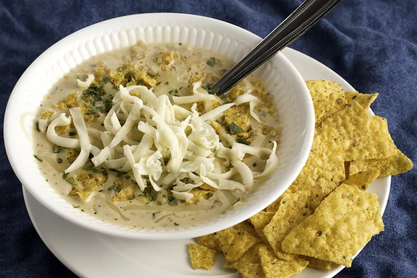 Ladle soup into bowls and top with shredded cheese, tortilla strips, and your favorite toppings.