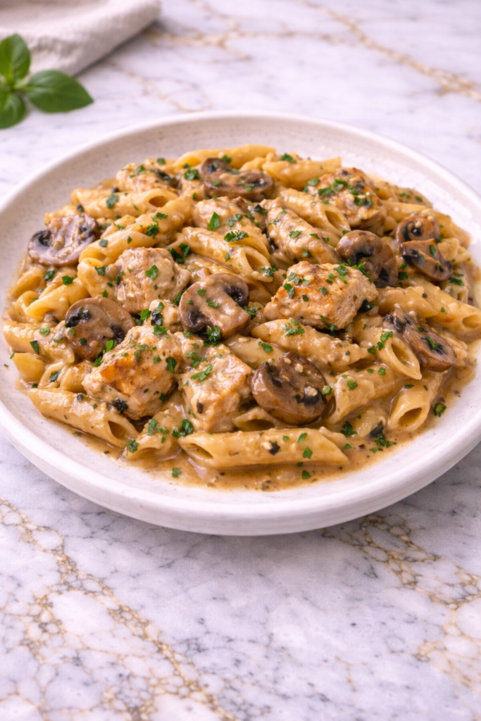 If you’d like to go further, you can cook the chicken and mushroom base ahead of time and refrigerate it. When ready to serve, reheat it gently and continue with the pasta and sauce. This keeps the dish tasting fresh while saving time.