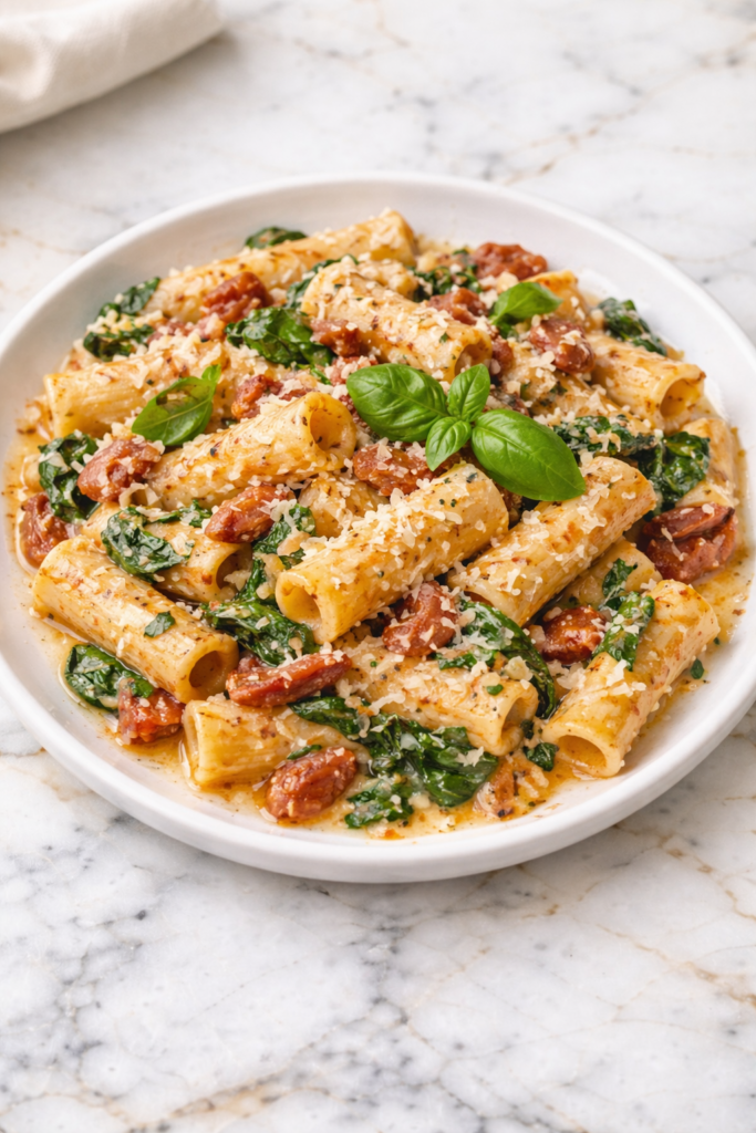 I started making this on nights when I wanted something that felt rich and restaurant-worthy but came together in a single pot without a lot of fuss. Sun-dried tomatoes, spinach, and a creamy garlic sauce build layers of flavor that make this pasta taste far more involved than it actually is.