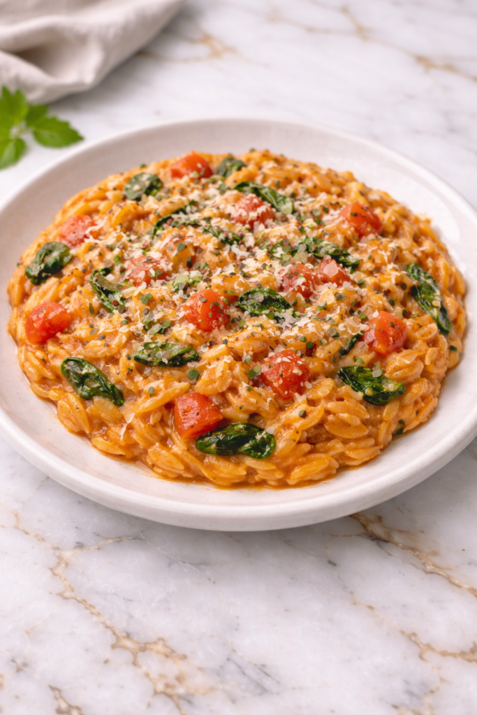 The orzo cooks right in the tomato broth and soaks up all that garlicky, herby flavor as it simmers. I’ll show you how to build a simple sauce base and add everything in the right order so the pasta comes out tender and creamy without turning mushy.