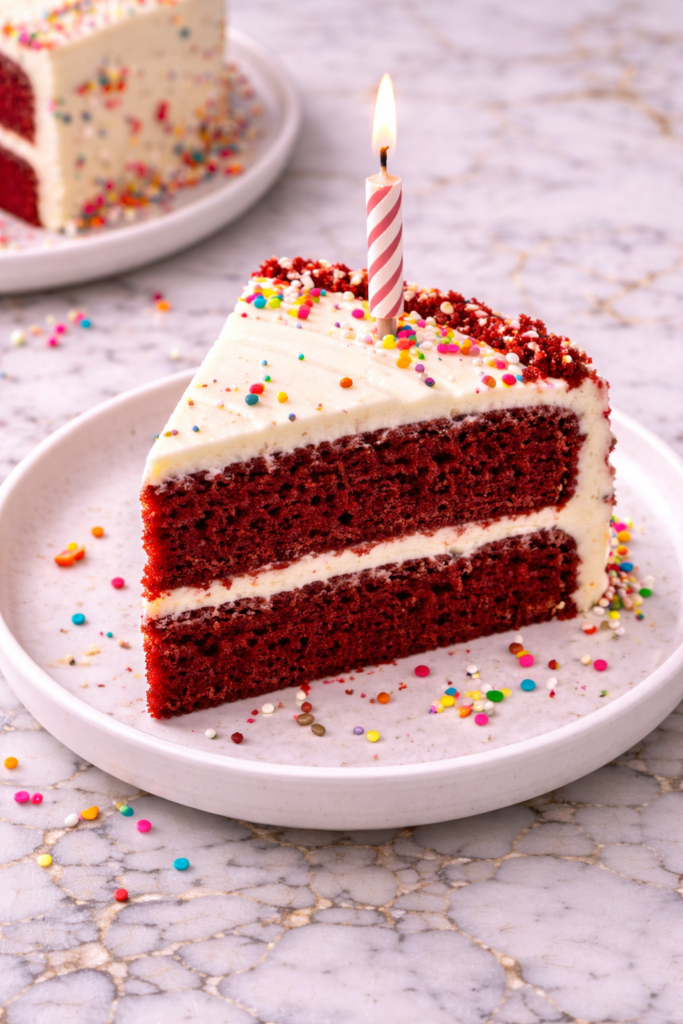 Turn this Red Velvet Birthday Cake into cupcakes by dividing the batter into lined muffin tins. Bake at 350°F for 18–20 minutes. This creates individual portions perfect for small gatherings.