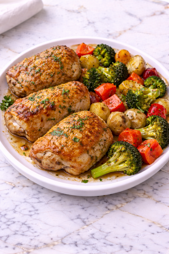 Chicken thighs and vegetables roast beautifully together on one pan — the chicken stays juicy, the vegetables get tender and caramelized at the edges, and everything picks up flavor from cooking together in the same heat.