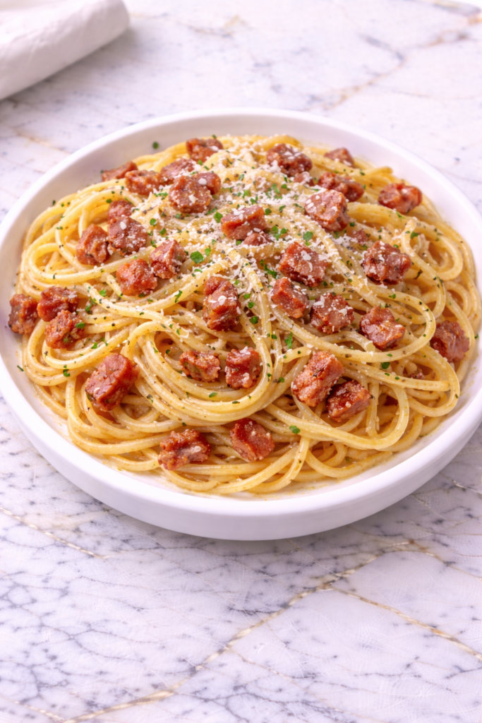 Spaghetti Carbonara with Pancetta is rich and satisfying on its own, making it perfect as a main dish for dinner. Its creamy texture and savory flavor make it feel complete without needing many additional sides.