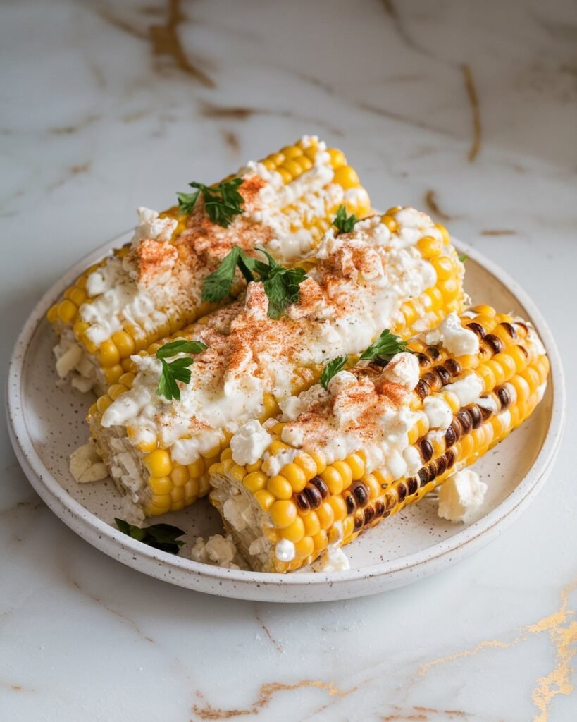 Once your corn is perfectly grilled with those gorgeous char marks, it’s time for the grand finale. Remove the ears from the grill and, while they’re still hot, generously brush them with your garlic feta butter mixture. The heat from the corn will melt the butter, allowing all those flavors to seep into every kernel. For an extra touch of freshness and color that makes the dish pop, sprinkle a bit more chopped parsley over the top. The contrast between the charred corn, the creamy, tangy butter, and the bright green herbs creates a dish that’s as beautiful as it’s delicious.